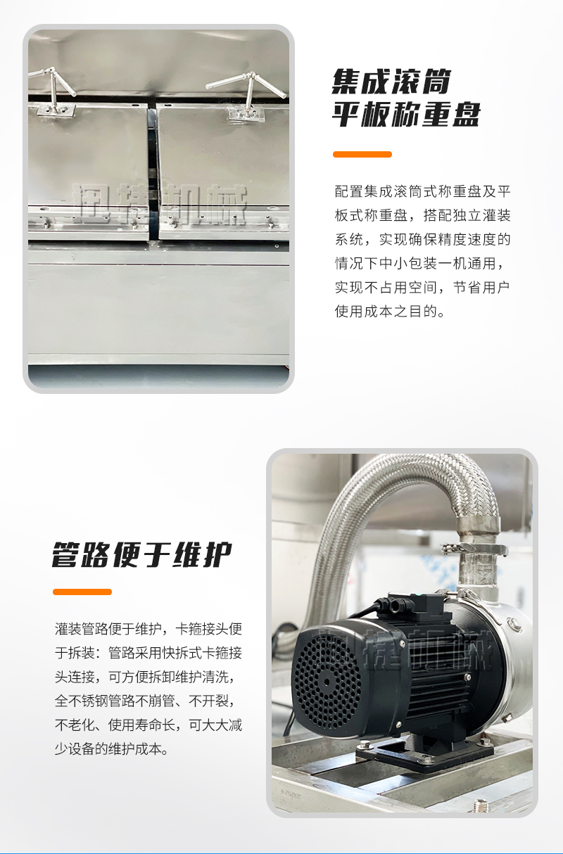 5.集成滾筒、平板稱重盤(pán),一機(jī)多用,方便快捷:配置集成滾筒式稱重盤(pán)及平板式稱重盤(pán),搭配獨(dú)立灌裝系統(tǒng),實(shí)現(xiàn)確保精度速度的情況下中小包裝一機(jī)通用,實(shí)現(xiàn)不占用空間,節(jié)省用戶使用成本之目的。